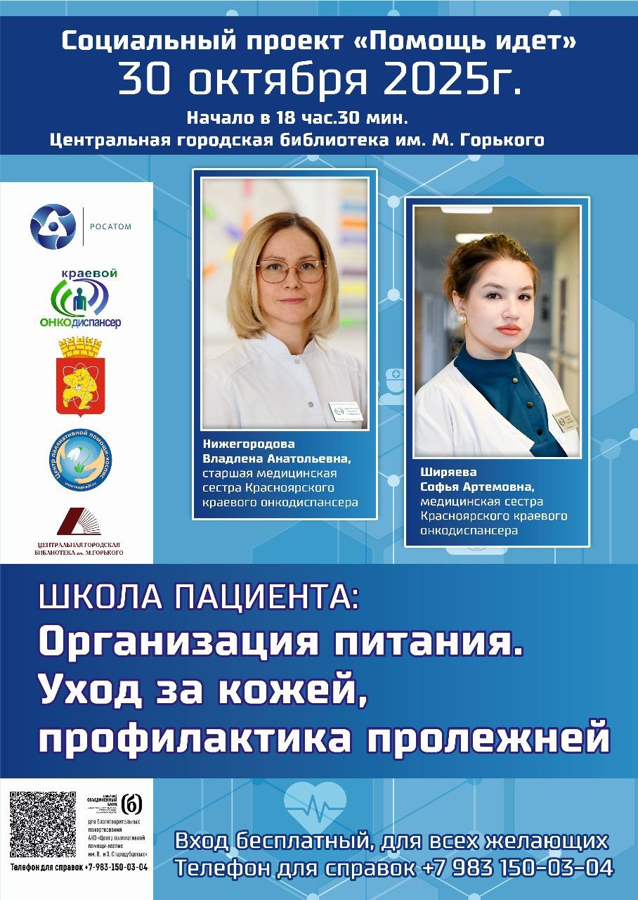 Уважаемые горожане! 30 октября и 13 ноября в Центральной городской библиотеке им. М. Горького (ул. Крупской,8) состоятся встречи со специалистами Красноярского краевого онкодиспансера. Начало 18:30. Вход свободный.